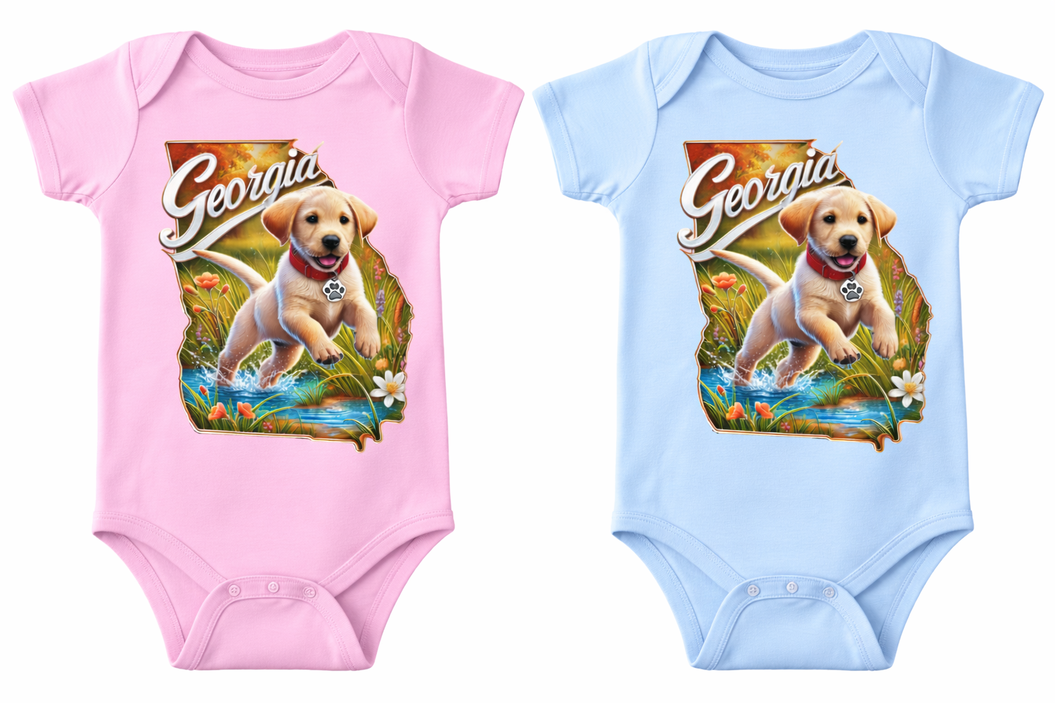 Crafted from premium 100% Gerber cotton, this Georgia Peach Puppy Onesie delivers exceptional softness and durability for your little one. The breathable fabric ensures optimal comfort while the reinforced snaps provide secure, hassle-free changes. Machine washable and designed to maintain shape and color through multiple washes.